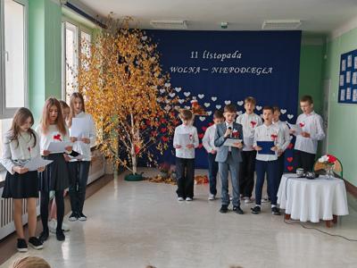 Uroczysta akademia z okazji Narodowego Święta Niepodległości przygotowana przez uczniów pod kierunkiem pani M. Majewskiej.
