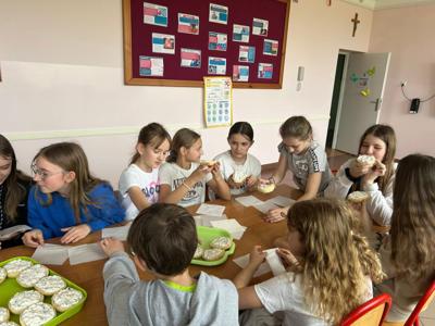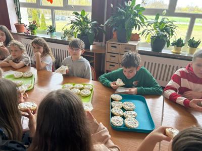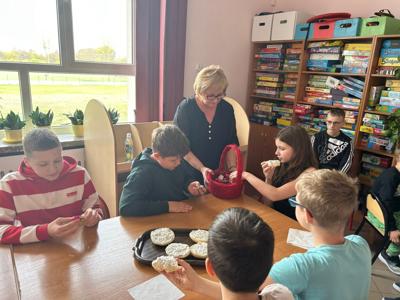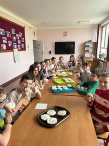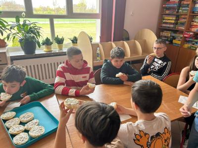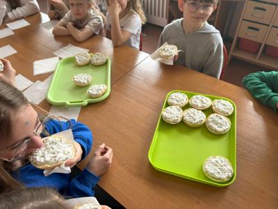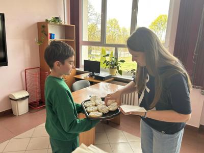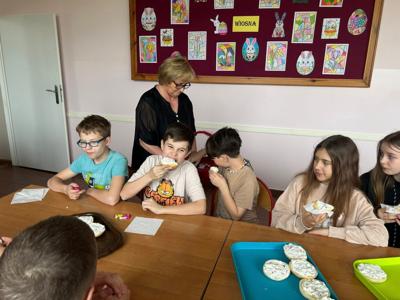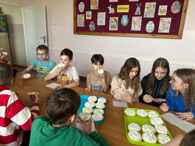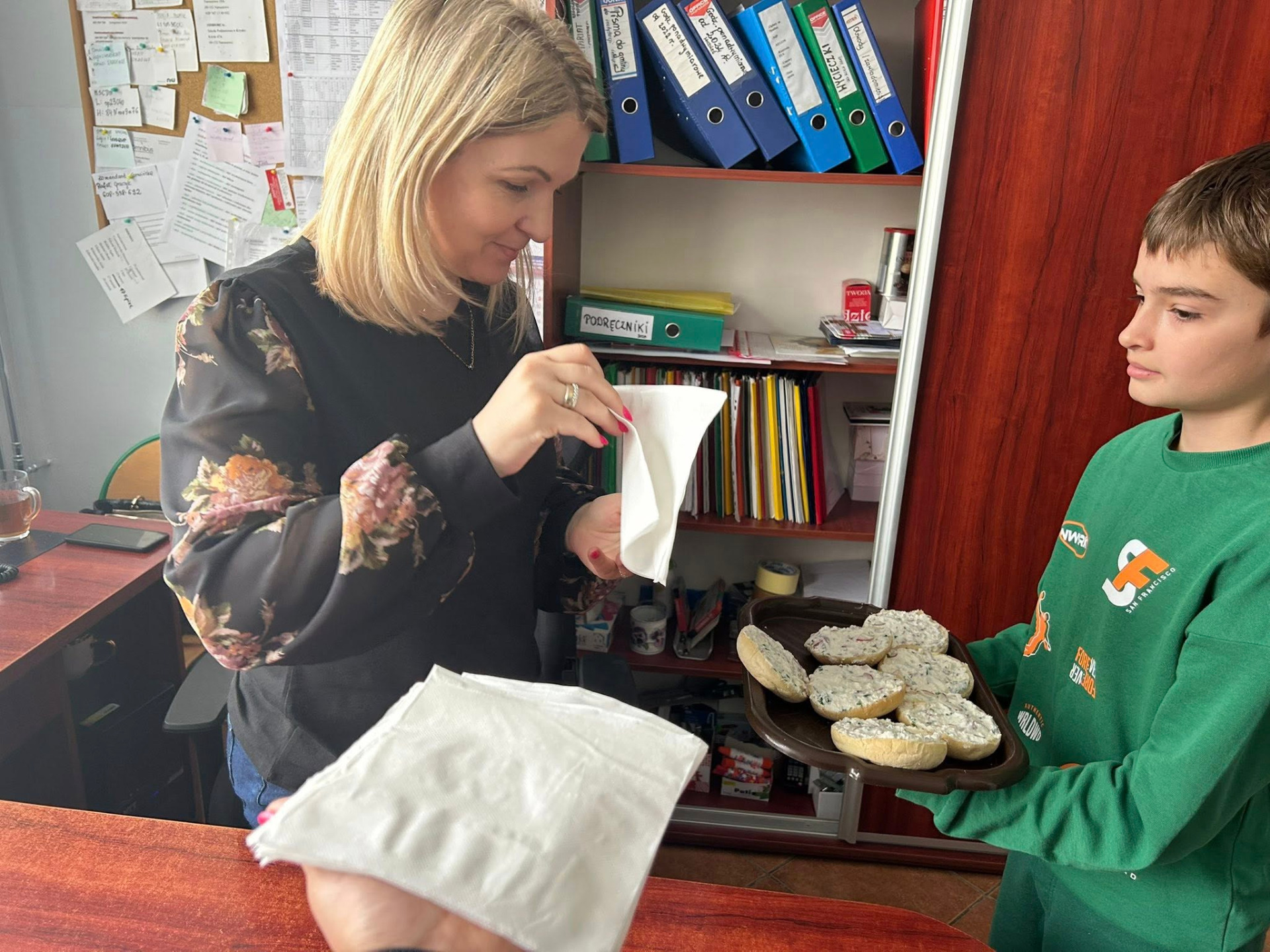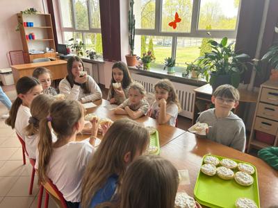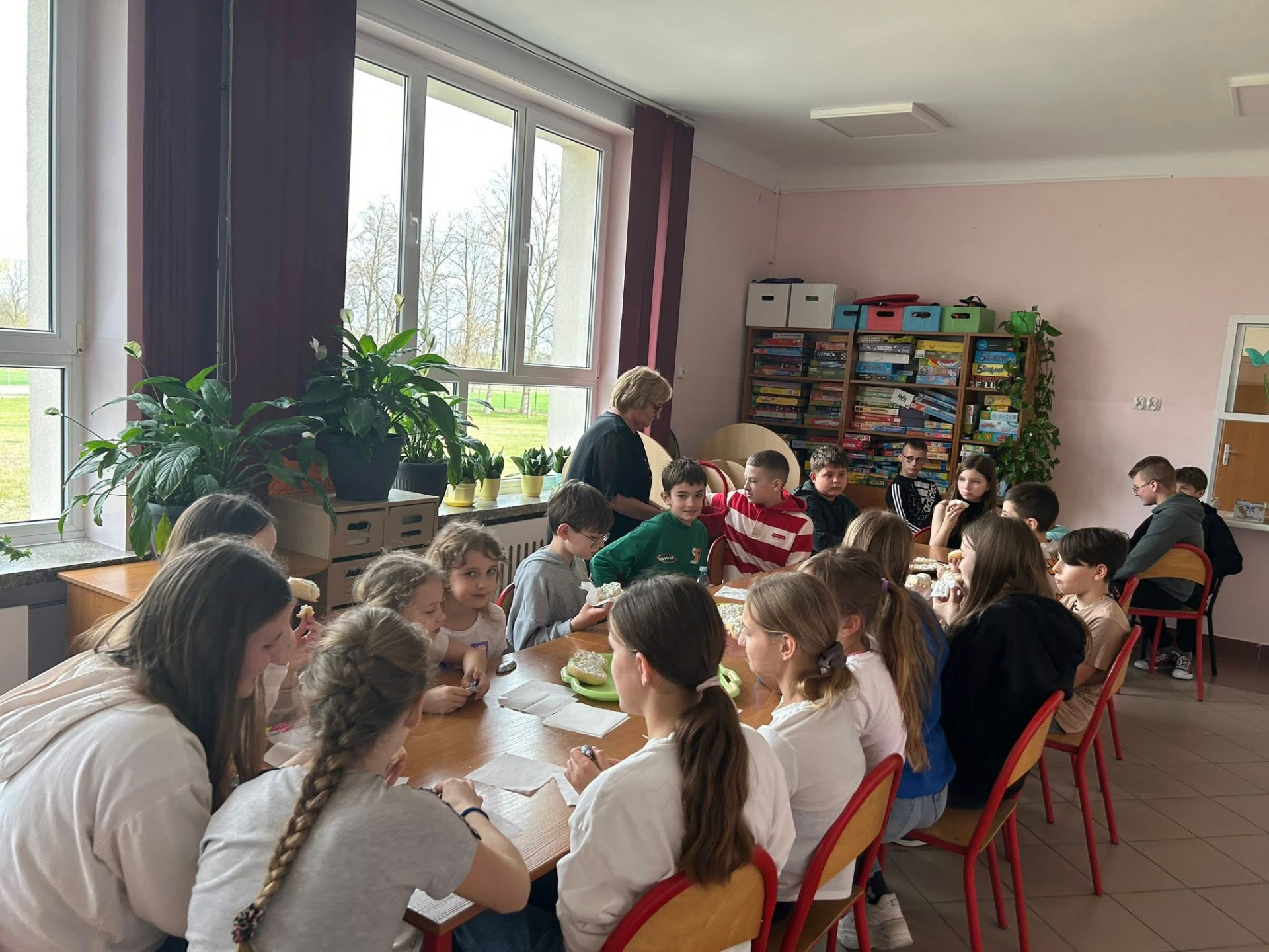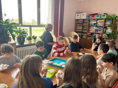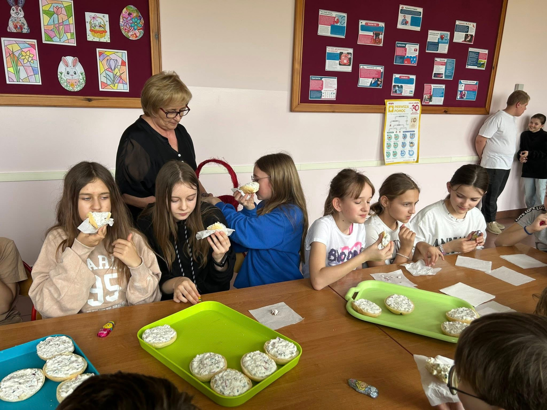 Samorząd Uczniowski zaprosił wszystkich uczniów i pracowników Szkoły na zdrowe drugie śniadanie - kanapeczki z twarożkiem z rzodkiewką, szczypiorkiem i jogurtem naturalnym! Było zdrowo i pysznie! Później Pani Dyrektor złożyła wszystkim życzenia i każdego osłodziła czekoladowym zajączkiem